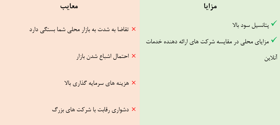 | راهاندازی کسب و کار محلی با پرینترهای سه بعدی | دسترسی به مشتریان محلی، ارتباط نزدیک با مشتری | هزینههای بالا، نیاز به تبلیغات محلی | پرینتر سه بعدی، محل کسب و کار، مجوزهای لازم | زیاد |