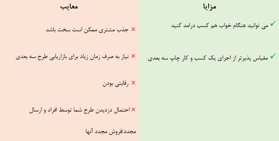 | راهاندازی سایت یا صفحه در فضای مجازی برای درآمدزایی | دسترسی به بازار جهانی، هزینههای کم | نیاز به تولید محتوا، رقابت بالا | پرینتر سه بعدی، نرمافزار طراحی، وبسایت یا صفحه مجازی | کم |